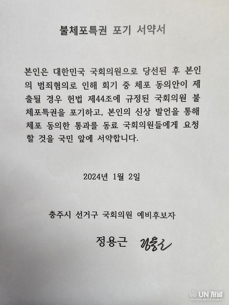 유엔저널 이존영 기자 | 제22대 총선 충주 출마를 준비 중인 국민의힘 정용근(58) 전 충북경찰청장이 2일 국회의원 불체포 특권 포기를 선언했다.