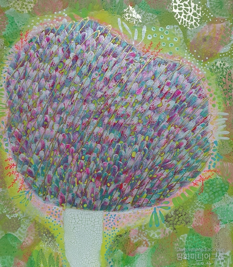 아크릴물감을 수백 수천 피스를 만들어 붙인다. 바탕을 그리고 다시 긁어내며 반복적으로 밀도를 높인다. 크렉을 표현한것은 출발점·대지·어머니의 자궁 등 존재의 근원을 은유한 것이다.