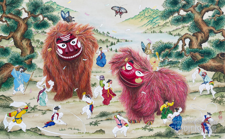 또한 전통 민화 특유의 평면적 구도 안에서 작가는 섬세한 필치와 현대적 감각을 더해, 옛 형식이 단순한 복고가 아닌 살아 있는 K-민화의 현재성으로 확장될 수 있음을 보여주었다. 특히 사자의 털 표현은 색채의 농담과 결의 흐름을 따라 자연스러운 움직임이 살아나, 작품 전체에 강한 생동감을 부여한다.