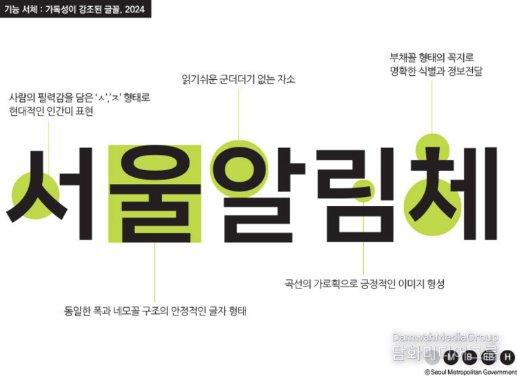 2008년 7월 오세훈 시장의 디자인 도시 선언과 함께 탄생한 서울서체는 강직한 선비정신과 단아한 여백의 미를 담고 있다. 조형적으로는 한옥의 열림과 기와의 곡선미를 표현했으며, '한강'과 '남산'이라는 서울의 대표 자산에서 이름을 따왔다.