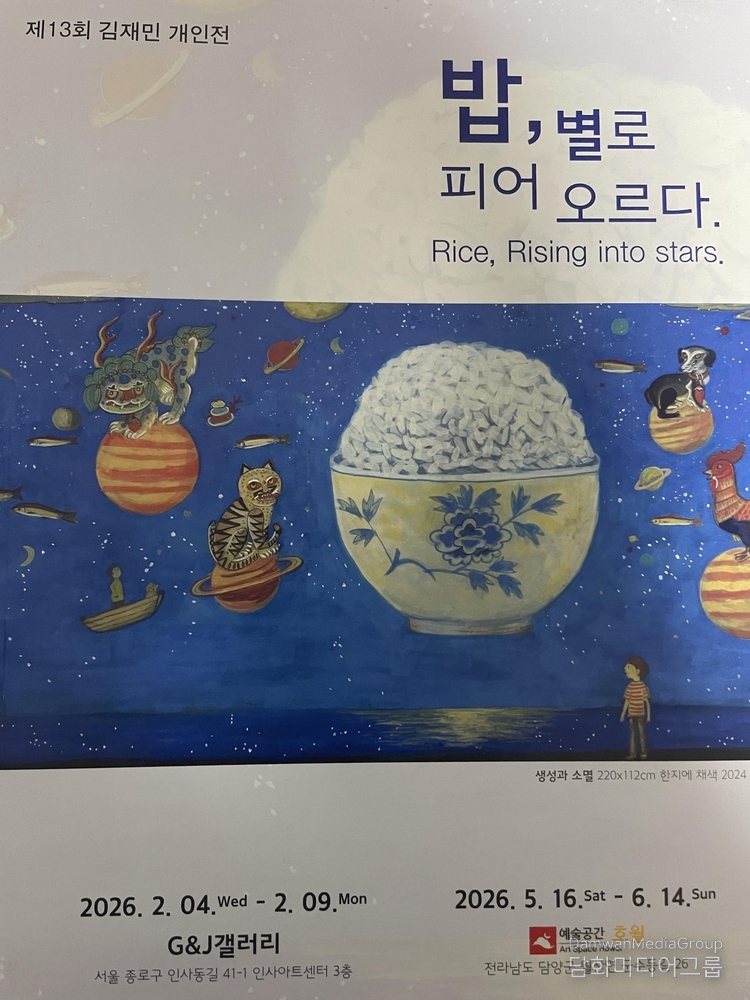 유엔저널 전득준 기자 |밥이 별이 되고, 별이다시 밥이 되는 흐름 속에서 작가는 나 자신의 기원을 떠올린다. 내가 어디에서 와서 어디로 가는지에 대한 질문을 담담하게 화폭에 담아내는 김재민 제13회 개인전 밥, 별로 피어오르다’ 전시가 G&J갤러리 (서울 종로구 인사동길 41-1)에서 2월 9일까지 열리고 있다.
