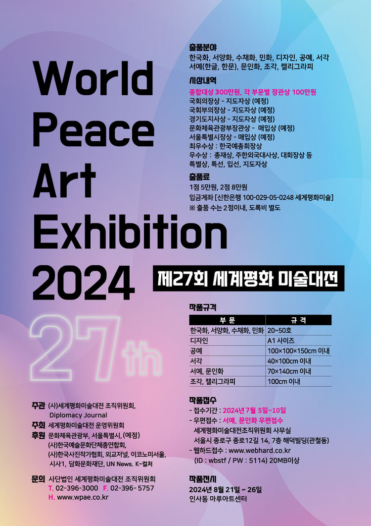 유엔저널 이미형 기자 | 제27회 세계평화미술대전이 오는 7월 5일~10까지 접수를 거쳐 8월 21일부터 8월 26일까지 인사동 마루아트센타 특별전시관에서 열린다.