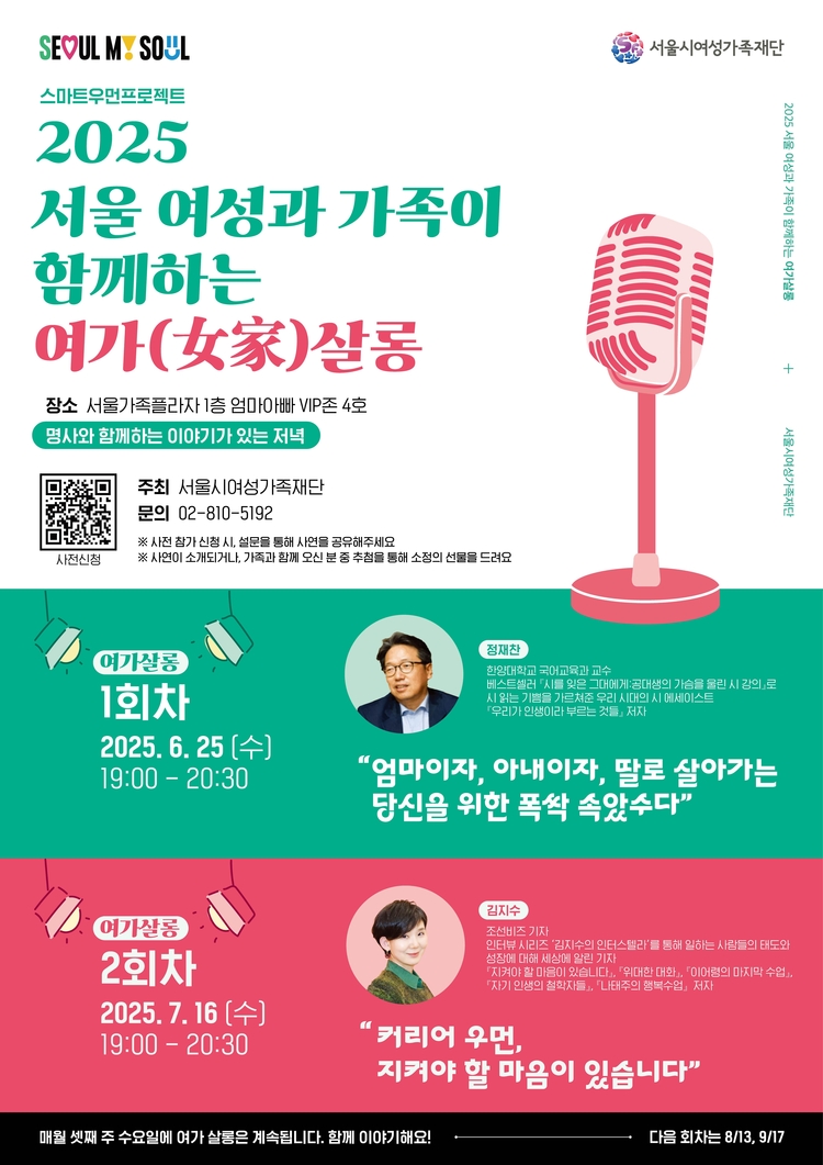 6월부터 9월까지 매월 셋째 주 수요일 저녁, 총 4회에 걸쳐 열릴 이번 행사는 서울가족플라자 내 엄마아빠VIP존 4호에서 진행되며, 서울에 거주하는 여성 및 시민 누구나 참여할 수 있다.