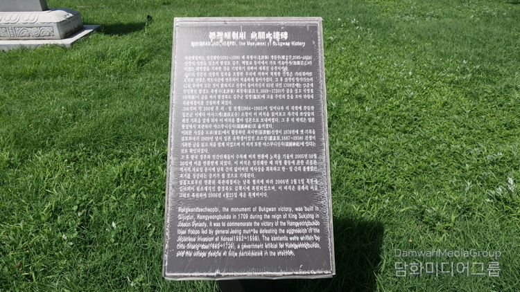 북관대첩비는 임진왜란 당시 정문부 장군이 함경도 길주·백탑교 일대에서 가토 기요마사加藤清正의 왜병을 대파한 ‘북관대첩’을 기념하여 1709년(숙종 35년) 북평사 최창대와 길주 지역민들이 세운 전승비다.
