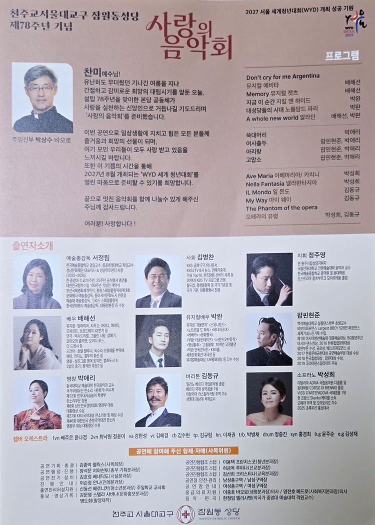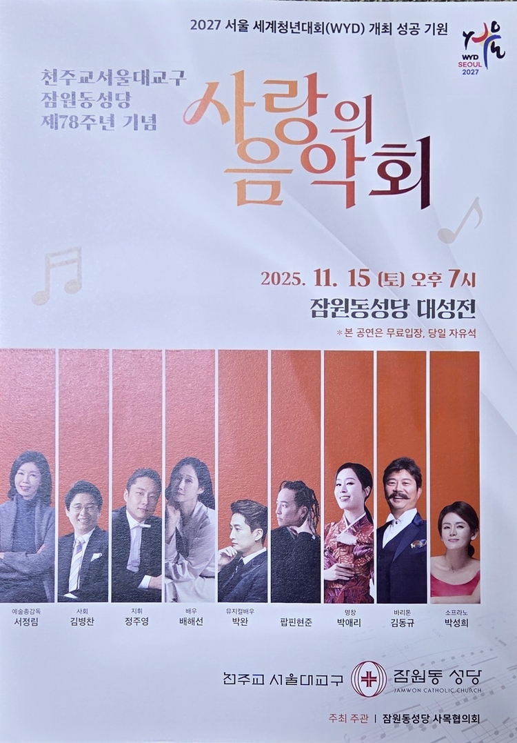유엔저널 김동현 기자 | 2027년 서울에서 열릴 세계청년대회(World Youth Day)의 성공적 개최를 기원하며, 천주교 서울대교구 잠원동성당 설립 78주년을 기념한 ‘사랑의 음악회’가 11월 15일 저녁 본당 대성전에서 성황리에 열린다.