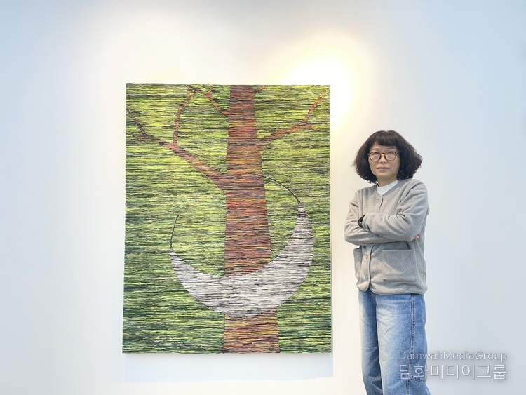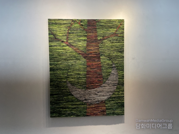작가는 한지를 직접 염색하고 채색한 뒤, 다시 잘라내어 캔버스위에 한 겹씩 쌓고, 쌓는다. 이 과정을 통해 이미지가 드러난다. 겹을 쌓는 행위 속에는 시간을 담아내고 있으며 층층이 쌓인 겹의 누적은 화면 속에 두 개의 공간을 만들어 낸다. 쌓고 채워진 겹의 사이의 공간과 채워지고 비워진 화면의 공간, 두 공간은 시간과 공간을 함께 보여주게 된다.